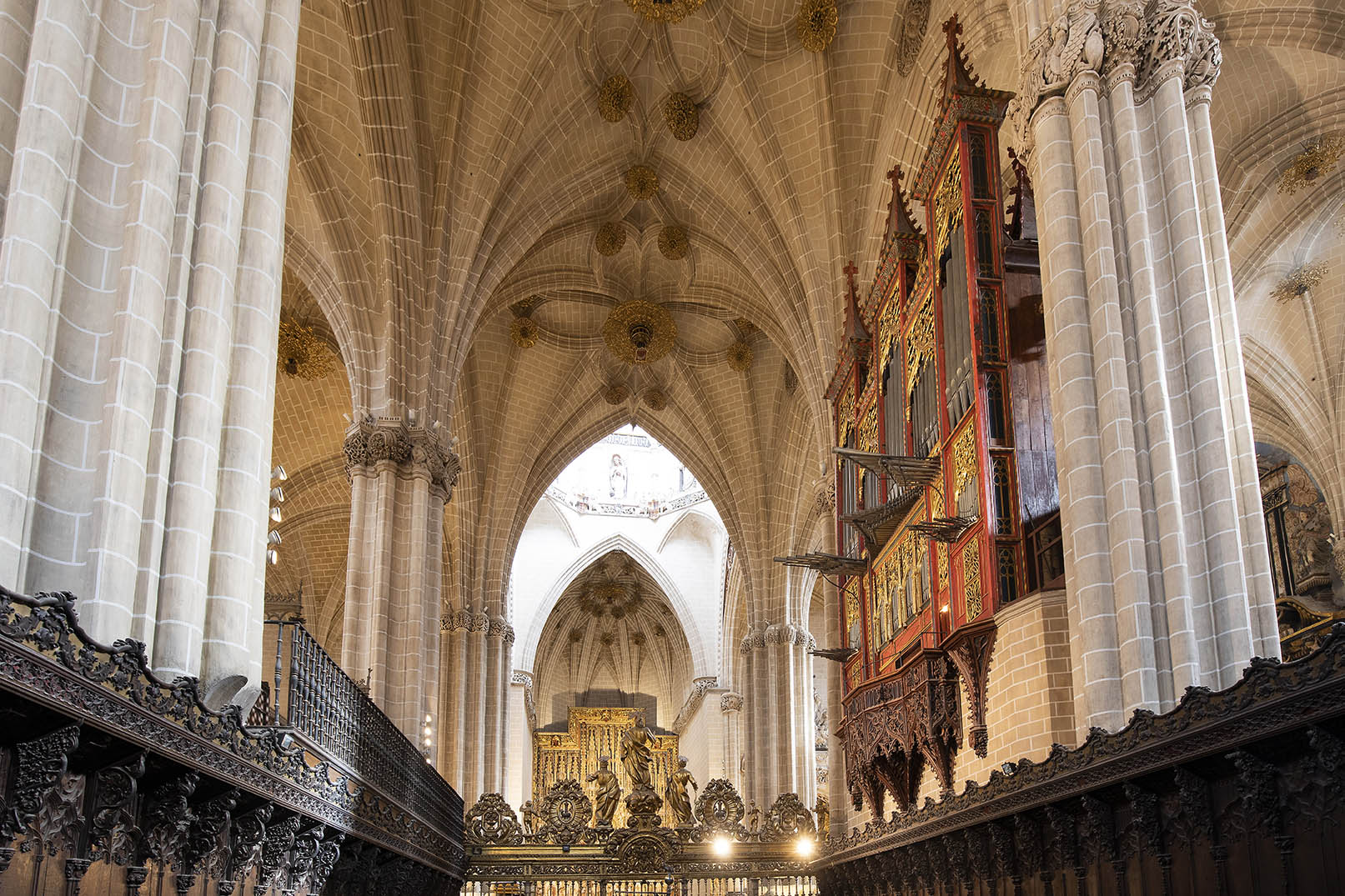 La nave se cubre con bóvedas de crucería de distintos tipos y presenta capillas abiertas en el lado del Evangelio. En el último tramo de la nave se eleva el coro alto, cerrado por un antepecho con decoración renacentista de carácter clasicista, con una amplia escalera de subida que concluye en una monumental portada de acceso de madera.